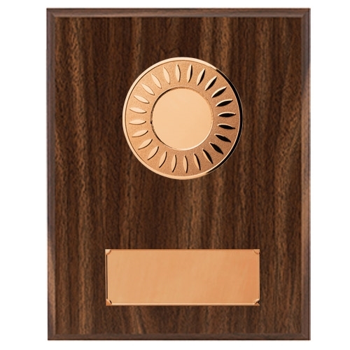 Träplakett brons - Klassisk och elegant träplakett med bronsskyltar. I cirkeln kan du välja att få en av våra många standardmotiv monterat eller eventuellt tryck av egen logga. Under cirkeln monteras gravyrskylten med önskad text. Med trä kommer också en variation i utseendet, och två av dessa plaketter kommer därför aldrig att vara helt lika. Plaketten har urfräsning på baksidan så den är enkelt att hänga upp eller ställa.
